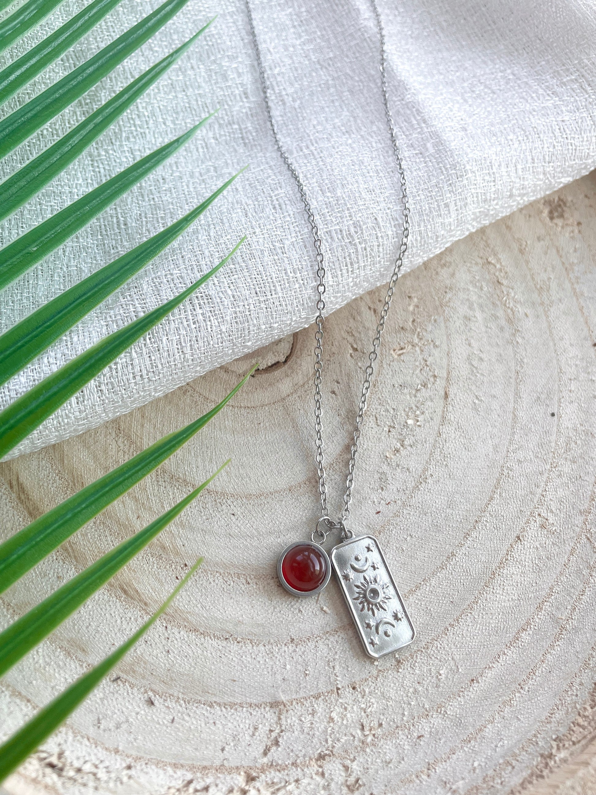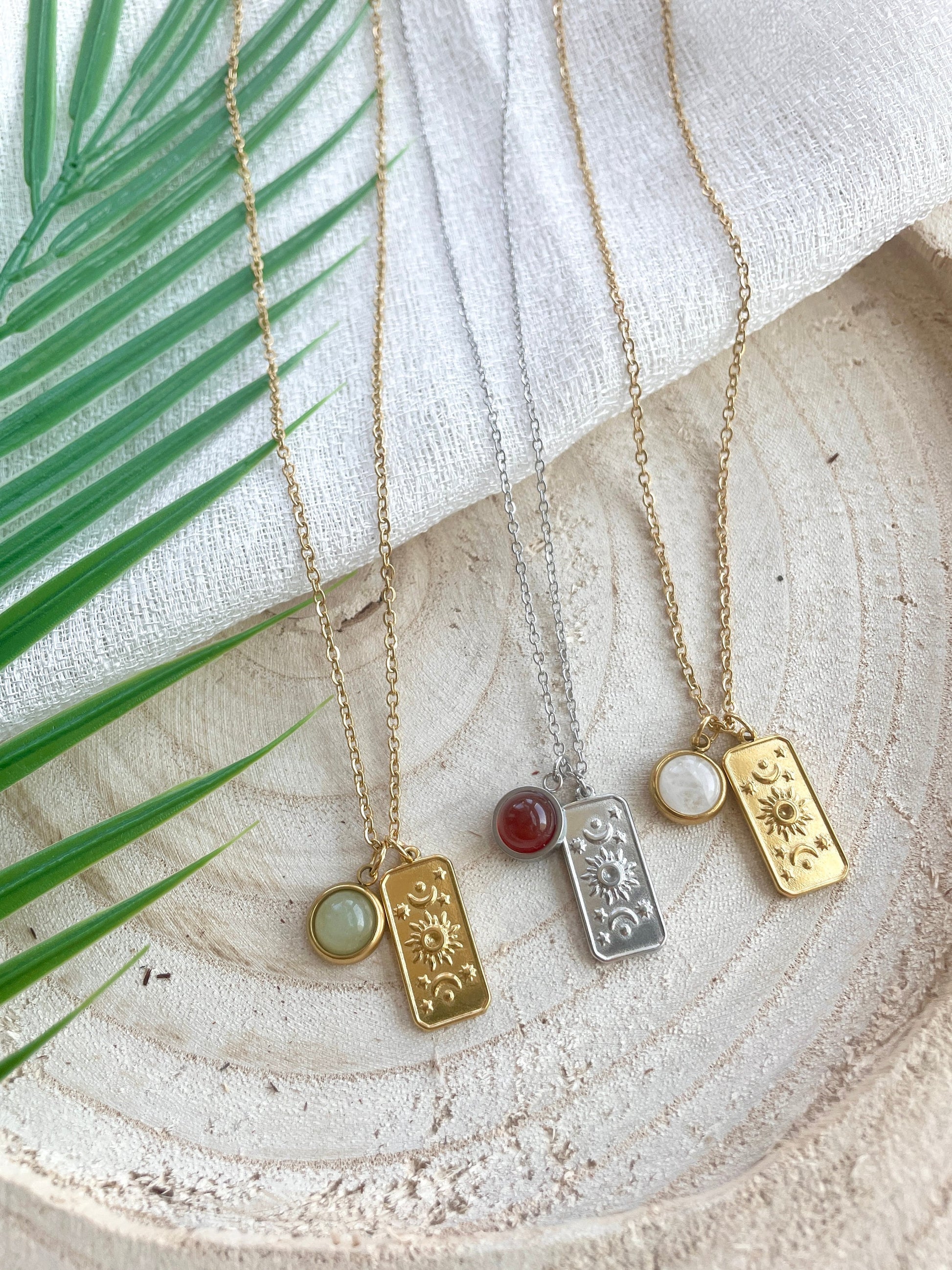 Die Thalassa Kette verbindet das Wechselspiel von Licht und Dunkel – eingefangen in einem zarten Medaillon mit Sonne & Mond. Dazu: ein kleiner Edelstein deiner Wahl, der deine persönliche Energie trägt.