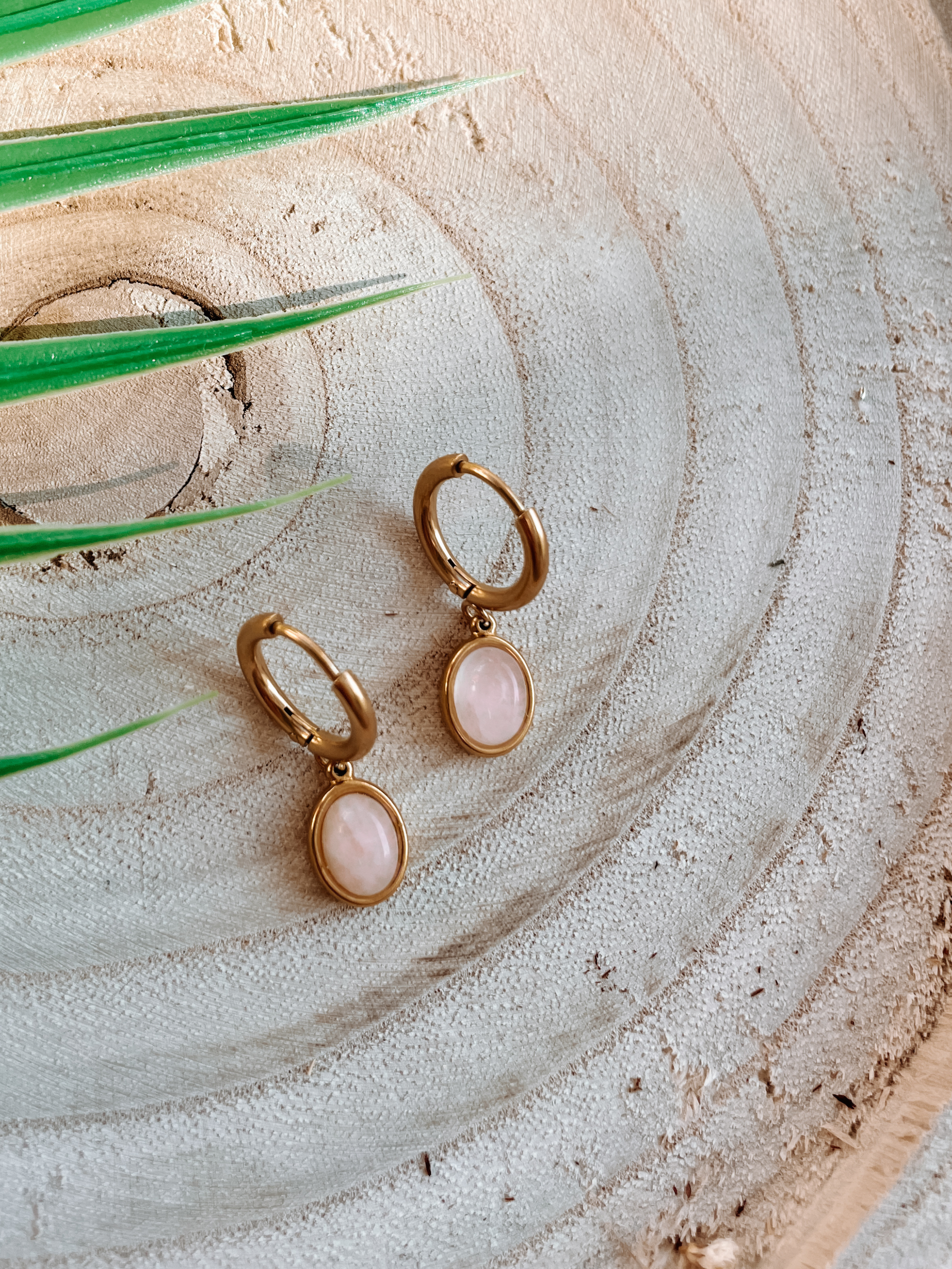 Die ovalen, sorgfältig gefassten Rosenquarz-Steine strahlen in sanftem Rosé und schmiegen sich leicht und angenehm an das Ohr, während die zarten Creolen dem Design Leichtigkeit und Eleganz verleihen.